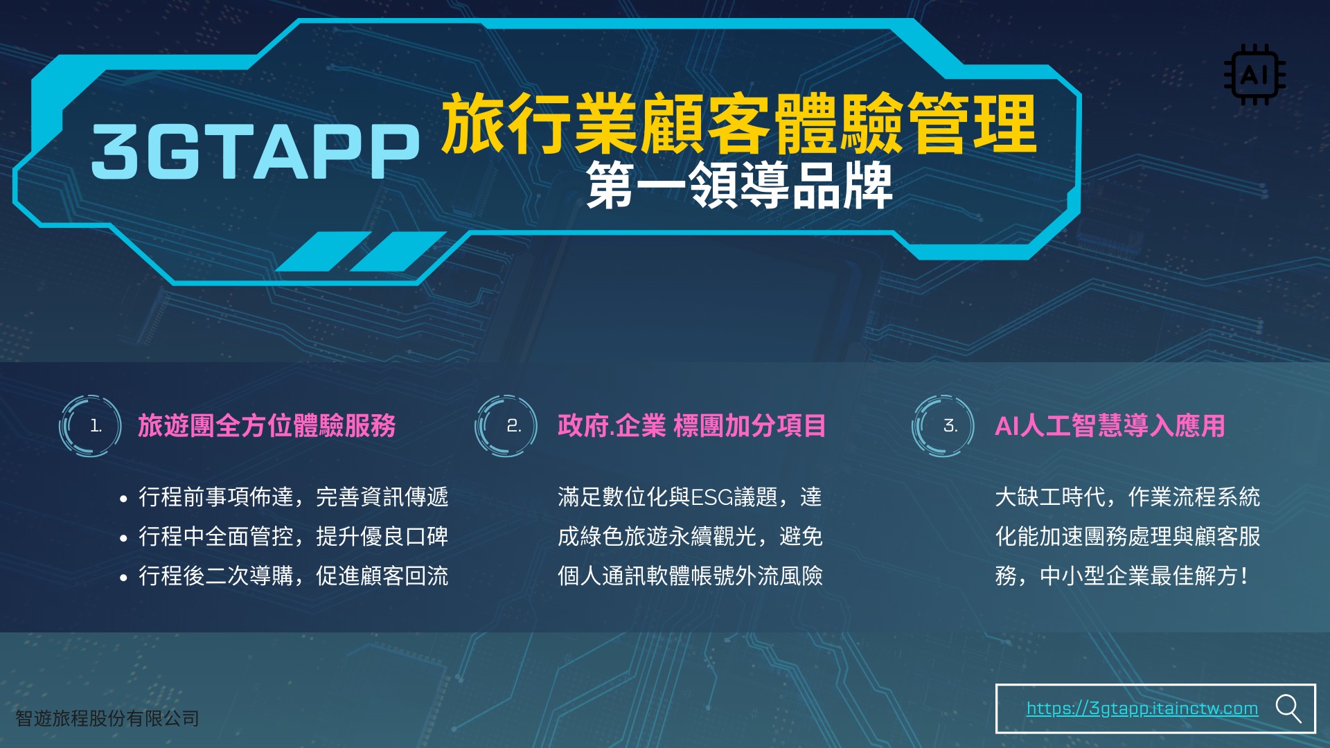 「AI團體旅遊應用系統3GTAPP」是目前市面上唯一可同時提供旅行社、領隊導遊、旅客,三方共用軟體系統。其主要核心價值將針對團體旅遊:解決旅行社顧客關係管理問題、解決領隊導遊控管旅行團問題、解決旅客資訊獲取及旅遊過程中體驗滿意度問題。